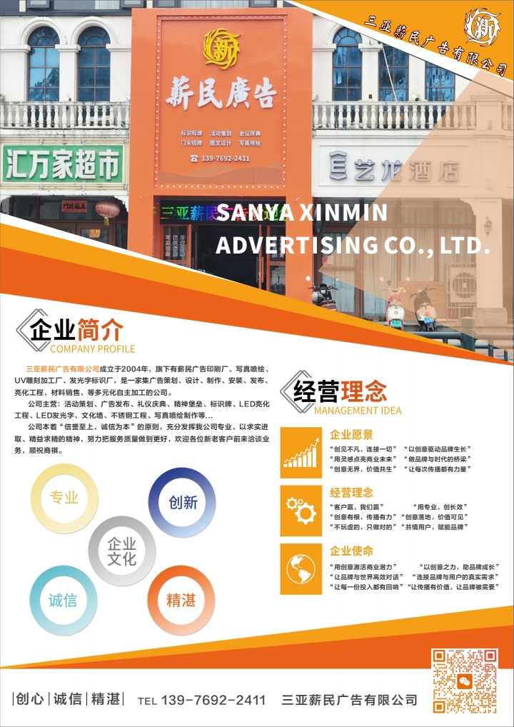 三亚薪民广告有限公司成立于2004年,旗下有薪民广告印刷厂、写真喷绘、UV雕刻加工厂、发光字标识厂,是一家集广告策划、设计、制作、安装、发布、亮化工程、材料销售、等多元化自主加工的公司。